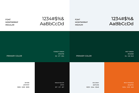 Основой визуального языка стали натуральные оттенки: зеленый, белый, серый и акцентный оранжевый.